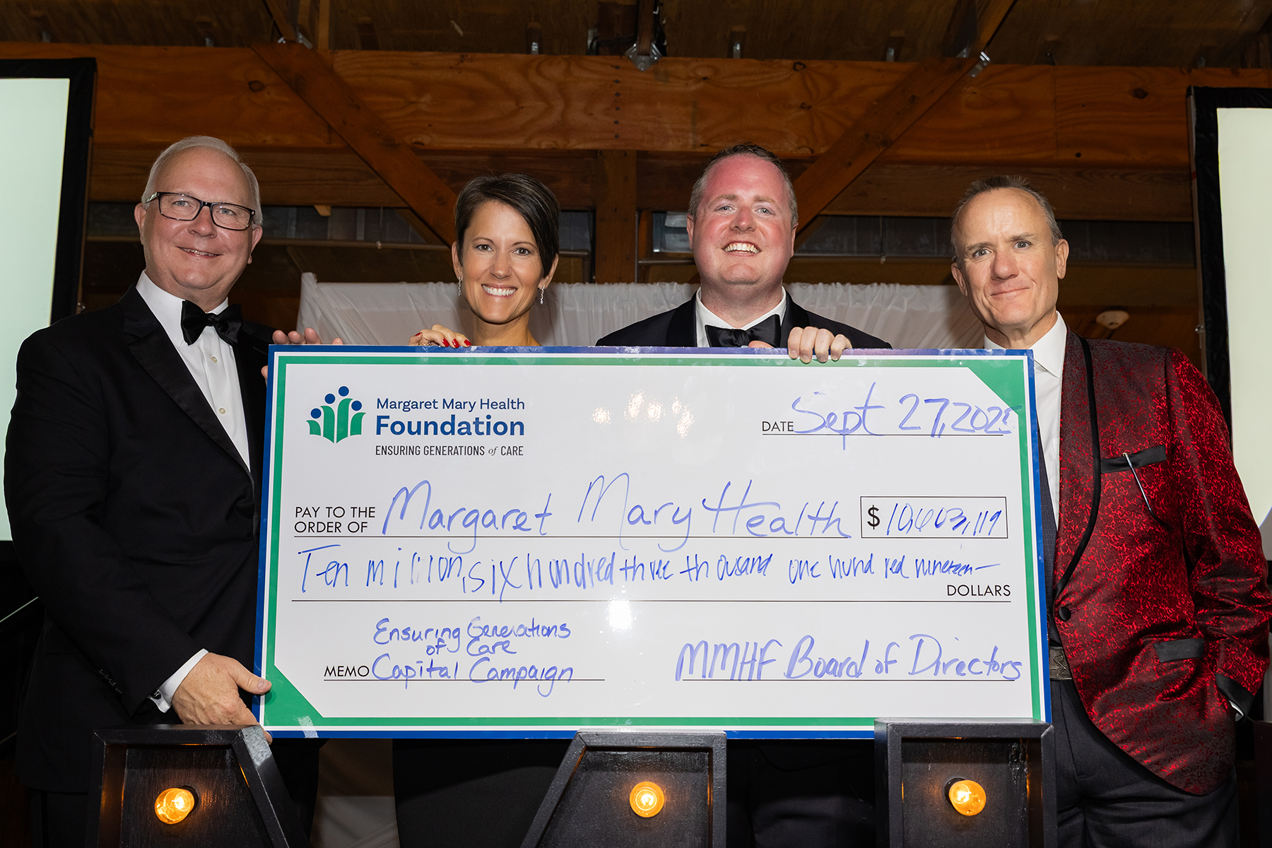 Margaret Mary Health Foundation presented a check for $10.6 million to Margaret Mary Health during its annual gala on Saturday. Pictured from left: George Junker, MMH Board Chair; Liz Leising, MMH President and CEO; Jonathon Maple, MMHF Executive Director; and Bill Hillenbrand, MMHF Board Chair