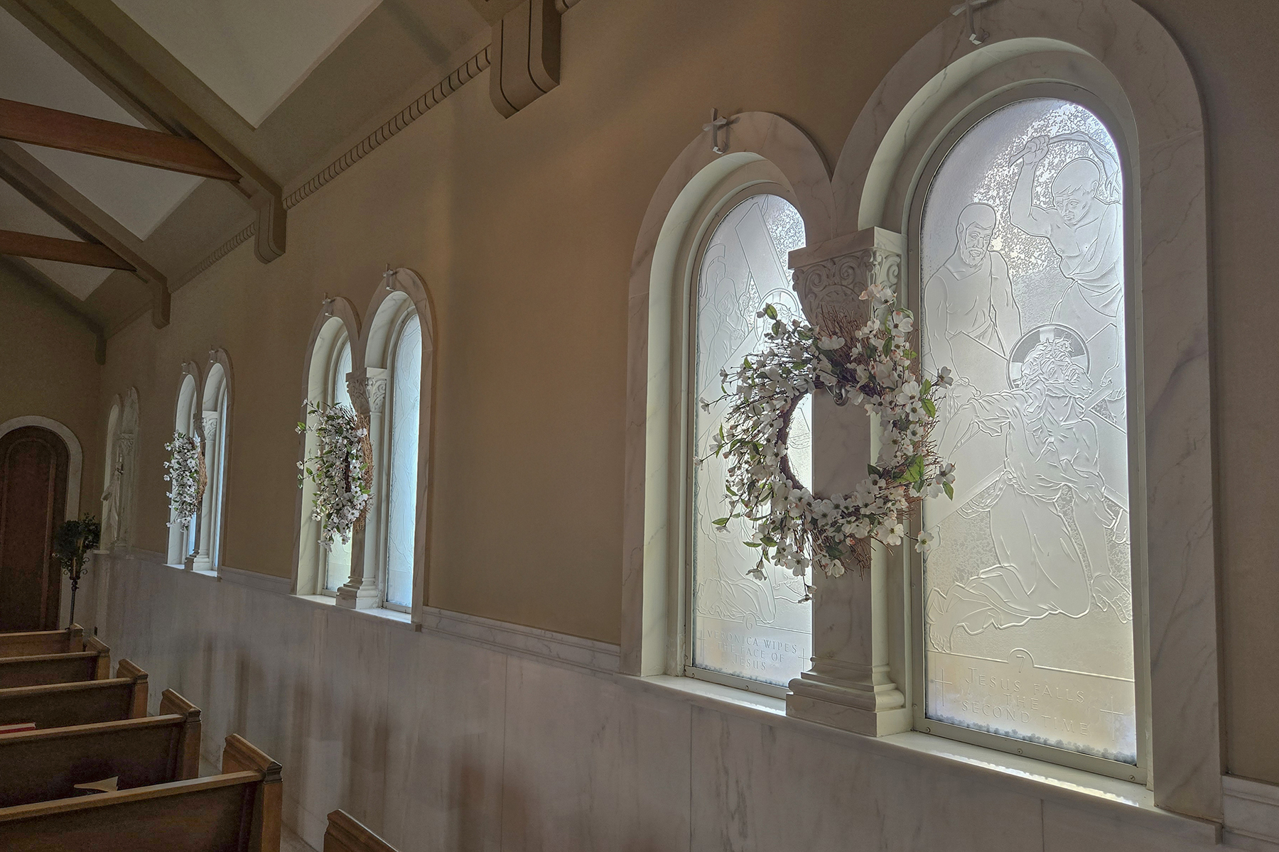 The beautiful etched glass windows from our current chapel (shown here) will be carefully relocated to the new hospital, preserving a meaningful part of our heritage. We can’t wait to see the finished space come to life!