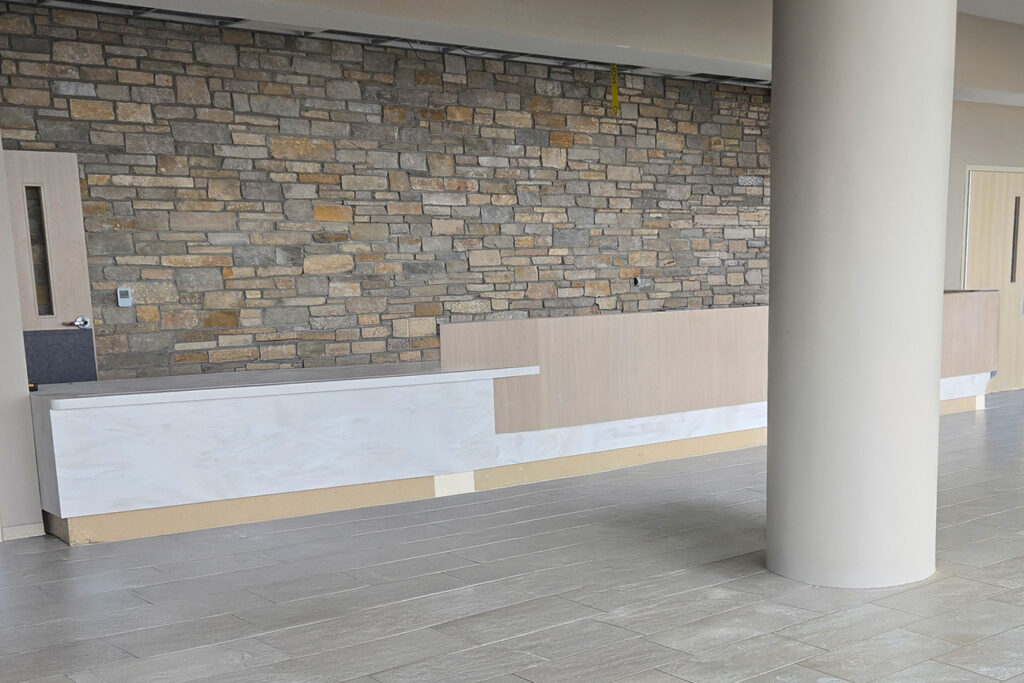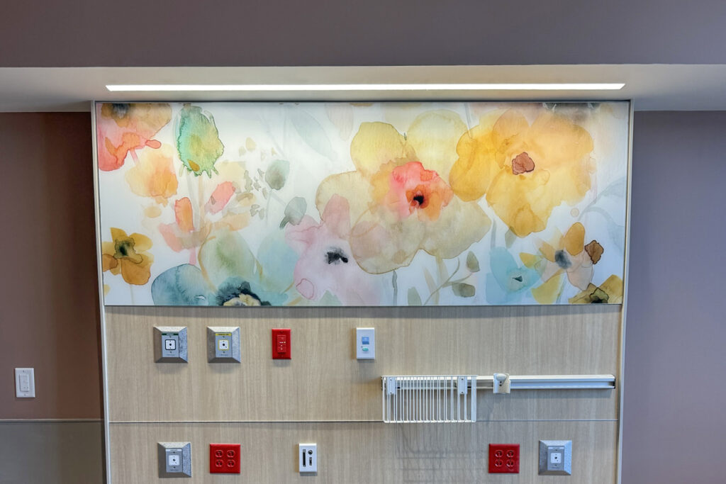 This space isn’t just state-of-the-art. It’s designed with intention. From the stone wall at registration to the glass artwork on patient headwalls, every detail is falling into place. Neutral paint tones and large windows bring in natural light, creating a bright and welcoming environment.
